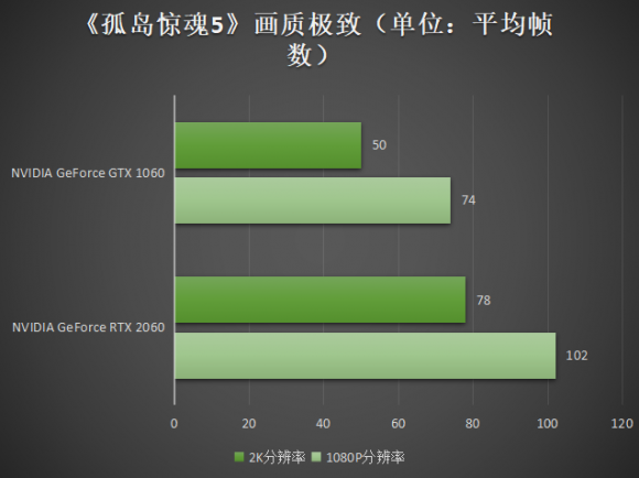 《孤岛惊魂5》在1080P分辨率极致画质下, GeForce GTX 1060的平均帧数为74FPS,可满足玩家畅玩体验,而同设置环境下,全新图灵架构的GeForce RTX 2060游戏实测数据已经突破百帧。对于追求更高的体验玩家, 2K极致画质下GeForce RTX 2060的优势更为明显,能保持在78FPS,而GeForce GTX 1060仅有50FPS。