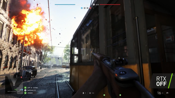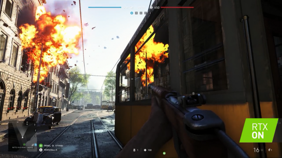 目前已经支持实时光线追踪和DLSS技术的首款RTX游戏《战地V》,在开启RTX特效后,如上图所示,右侧的电轨列车镜面可呈现左侧建筑物爆炸火焰实况,为玩家提供更真实的战场环境,增强游戏体验。
