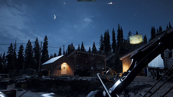 《孤岛惊魂5》开启2K分辨率和极致画质后,天空中的云、月亮和星星呈现出惟妙惟俏的感觉,与黑夜搭配出一副寂静的画面。树林郁郁葱葱,细节的打磨得无微不至,仔细观察也能看清树叶的轮廓。房屋门前的灯光亮度若隐若现,照出一种看似平静,氛围却阴森的感觉。