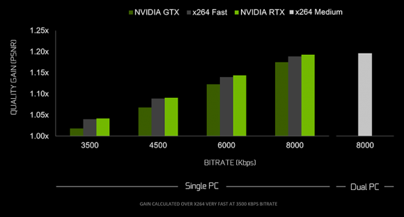 对于直播者而言,这意味着,GeForce RTX GPU可以获得优于x264 fast模式的图像质量,甚至接近于x264 medium模式的水平。