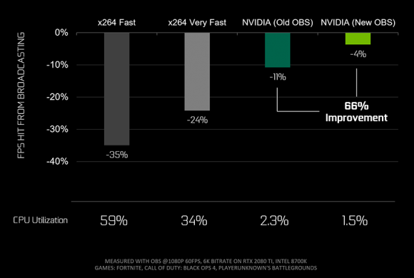 采用 NVENC 的当前 GeForce GTX GPU、700 系列及更新版本在实现这些优化后,将能够看到上述帧数增幅。OBS 发布后,StreamLabs 和 StreamElements 将在自己的客户端中实现这些改进。