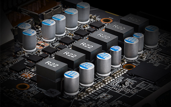 用料方面,迪兰RX 580 2048sp 4G X-Serial战将体现了大品牌在品质上的可靠性。选用双滚珠轴承风扇,使用寿命更长;采用6+1相供电,配合全固态电容和封闭式电感,为显卡核心提供充沛能源。