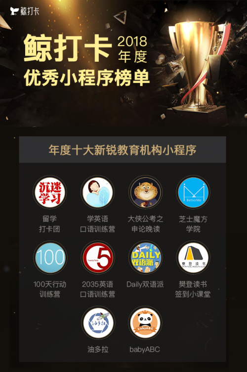2018年是小程序飞速发展的一年,也是鲸打卡在小程序+教育扎根深入的一年,而这扎根深入也是鲸打卡和鲸打卡“十大新锐教育机构”深入互动的一年。