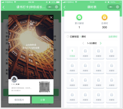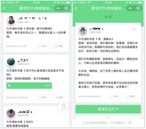 通过鲸打卡督学系统里的解锁课程,樊登读书的一县级授权点设置了300课时,完成一次读出感悟并打卡就可以解锁下一课时,这种具有闯关式的模式极大提升了学员的打卡积极性;学员完成打卡后还可以查看其他学员的打卡信息并相互评论,以及邀请好友参与等功能,很有助于拉新。