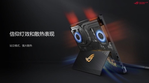 笔记本散热部分设计首先是整体风道设计,这个环节会决定你整个散热系统从进风到出风的效率。针对不同笔记本,风道设计是不同的,比如ROG冰刃3s Plus就采用了风洞架构(主动式空气力学AAS结构),而超神X则采用特别的“站立模式”,这两种不同的整体风道设计,都是针对不同笔记本设计的结果,目的都是增加冷风的进风量,同时加速热风导出。