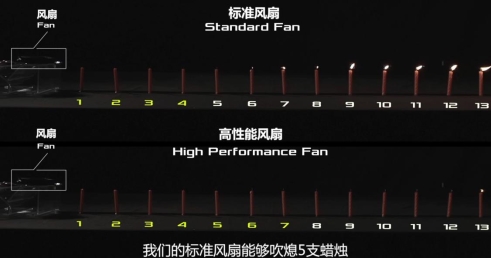 风量不仅大而且强:下面这个是吹蜡烛实验,我们放一排蜡烛,然后用风扇从侧面吹,看风扇能吹灭第几根蜡烛。普通标准风扇基本吹到第五根蜡烛,后面的蜡烛基本就无动于衷了,而ROG高性能风扇可以吹到第十根蜡烛,风量不仅大而且强,只有这样的设定才能保证吹透散热器,保证散热效能不会浪费。