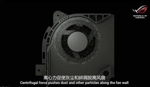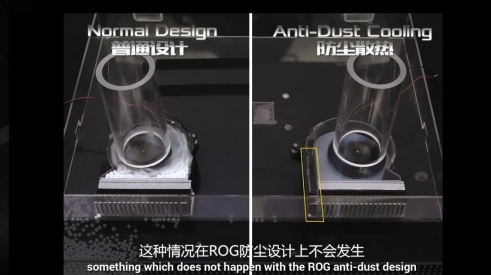 针对绝尘风扇,ROG研发了独家设计的防尘散热系统,在每个风扇旁边都有一个独立的防尘通道,通过离心力,散热过程中产生的灰尘和碎屑脱离风扇通过防尘通道排出,避免了灰尘在散热片上的堆积,下面的实验也可以很直观对比“绝尘风扇”与普通风扇在避免灰尘堆积上面效果的对比,采用了防尘散热的绝尘风扇,几乎不会有碎屑的堆积。