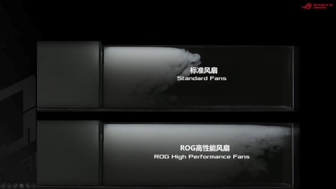 ROG笔记本采用的都是12V高性能风扇,我们通过两个小测试来对比标准风扇,一个是固定风道风量测试,通过烟雾示意,我们可以很形象的看到在固定散热条件下,ROG高性能风扇可以比标准风扇产生更多的风量,增加进出风。