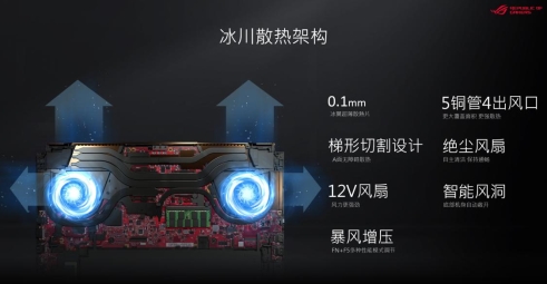 在笔记本设计环节,“散热”并不是简单的把散热器塞到笔记本内部那么简单,而是需要厂商设计一个完整的系统。一个完整的散热系统包含结构设计跟各个散热组件,从而形成一个完整的散热架构。我们以ROG冰刃3s Plus上面的冰川散热架构为例,整个冰川散热架构设计包含了梯形切割设计、12V绝尘风扇、5铜管4出风口、0.1mm冰翼超薄散热片、智能风洞和暴风增压模式,形成了从单体散热配件、散热风道到智能控制模式的全方位组合,而这个散热系统组合也是冰刃3s Plus发挥实力的关键所在。