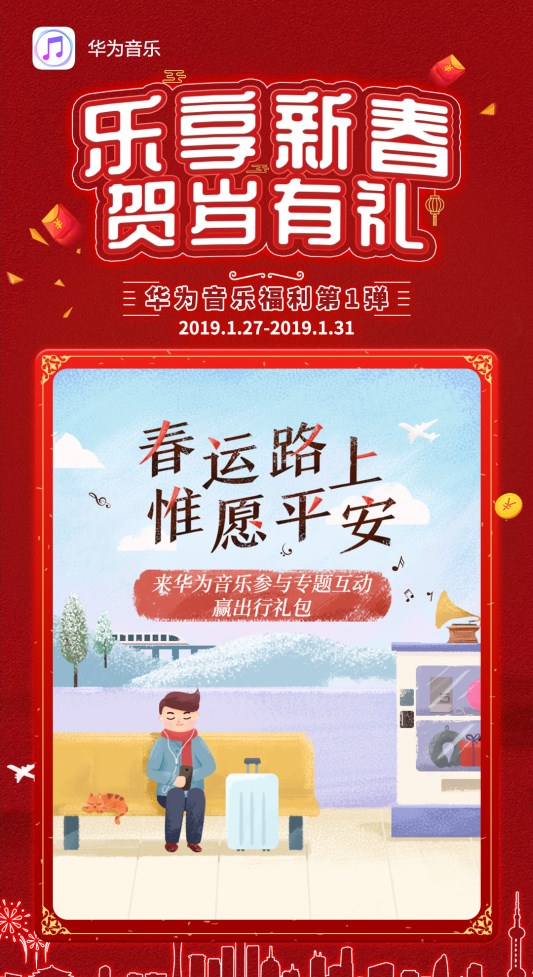 其实,真正的“华为红”不仅露于产品表面,还藏于“内”——细心的用户不难发现华为音乐已上新了充满节日气息的“新春快乐”皮肤。1月31日-2月3日期间,凡换上华为音乐“新春快乐”皮肤的用户,在“寻找华为红,我要成锦鲤”的话题圈中分享新年新意,晒出皮肤即有机会成为华为音乐专属锦鲤,获得由HUAWEI Mate 20、HUAWEI FreeBuds 2无线耳机、华为AI音箱、华为音乐VIP年卡、音乐惊喜周边等优质好礼组成的锦鲤大礼包,总价值高达8000元,只为独宠你一人。