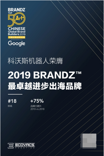 3月29日,WPP携手Google发布了 BrandZ™ 2019中国出海品牌50强排行榜和报告 。其中, 家用服务机器人领导者品牌科沃斯机器人再次登榜,飞升至榜单18位,更荣膺“最卓越进步出海品牌”。在此次品牌力评估中,科沃斯机器人品牌力相比2018年提升了75%,更是上榜企业中唯一的家用服务机器人公司。