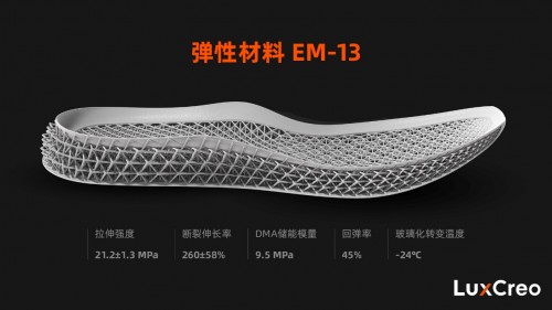 LuxCreo清锋时代对EM系列弹性材料进行再升级,升级后的新材料EM-13应用于运动鞋中底后,在回弹、减震、重量等方面的数据表现已全面优于市面在售3D打印鞋底,且部分关键性能指标已超越市面在售高端发泡鞋底。目前EM系列弹性材料已通过SVHC201(欧盟安全标准)、US California Proposition 65(美国安全标准)、ISO 10993-10:2010(皮肤致敏性检测)和RoHS Directive (EU) 2015/863(环境安全标准)测试,以上检测报告均由SGS出具。