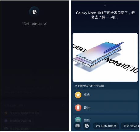 用户可通过Bixby专属的物理按键或语音“Hi,Bixby”来唤醒手机中的这位“AI朋友”,随后便可以通过语音交流或点触的方式了解刚刚发布的Galaxy Note10系列的具体信息。比如,当我们对Bixby说“我想了解Note10”或“介绍一下Note10”,甚至是问Bixby“Note10怎么样”,Bixby都可以提供三星Galaxy Note10系列相关的分类信息,以便我们查找。