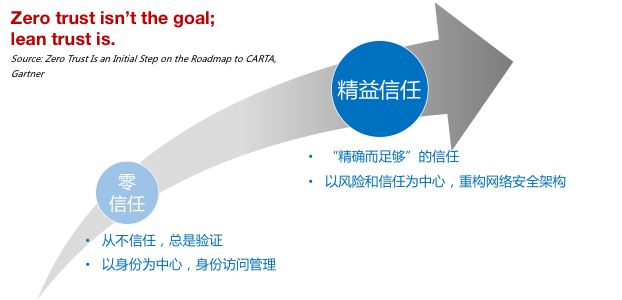 此外,零信任如何低成本落地等问题也成了零信任实践过程中的难题。针对这些问题,国际权威IT研究分析机构Gartner在研究报告《Zero Trust Is an Initial Step on the Roadmap to CARTA》中,认为网络安全应基于风险和信任的监测、评估、学习和调整,最终实现对风险和信任的精益控制。这一目标在报告中被描述为精益信任(Lean Trust)。而零信任只是实现这一目标的第一步。