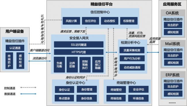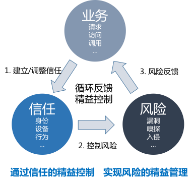 访问过程中,通过检测分析中心、终端管理中心、身份认证中心,对访问行为、设备状态、环境态势、资源安全等级进行持续的风险和信任评估。依据评估结果,精益调整信任等级以及访问控制规则。持续循环反馈,实现信任和风险的精益控制。
