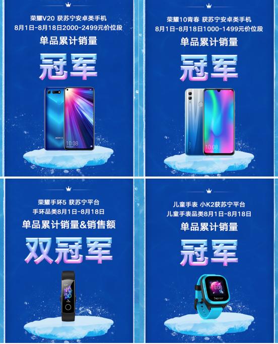 值得强调的是,在苏宁易购平台,荣耀V20、荣耀10青春版、荣耀手环5以及荣耀儿童手表小K2也纷纷斩获销量及销售额冠军佳绩。
