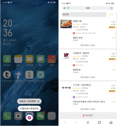 除了查找心仪的餐厅,Breeno 还能够帮助我们订外卖,同样,订外卖功能也支持多维度识别。不论我们对 Breeno 说出「我要点一份外卖」、「帮我点一份黄焖鸡」、「帮我点一份 KFC 」还是「帮我点一份杭帮菜」,Breeno 都能够准确识别并打开美团外卖 H5 页面显示相关信息。有了 Breeno,想点外卖时也不用打开外卖 APP 一页页搜寻,直接告诉 Breeno 即可。
