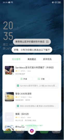 当然,Breeno 的能力不止于此,它还具备同时提取多个关键词并进行精准搜寻的能力。面对“推荐南山区评价最好的牛排店”这样复杂的句子,Breeno 也能够游刃有余,并进行精准推荐。