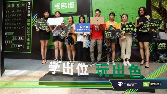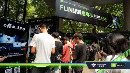 9月10-9月13日四天的时间里,在武汉工程大学、光谷职业学院以及湖北大学的校园里,人潮涌动,热火朝天的那一抹绿就是英伟达与机械师的联合展区了,以“FUN肆躁,显身手”为主题的互动区,充满了热血与竞技热血,高性能战机、智潮周边产品以及各色电竞奖品坐镇,吸引了不少高校学子驻足参与。