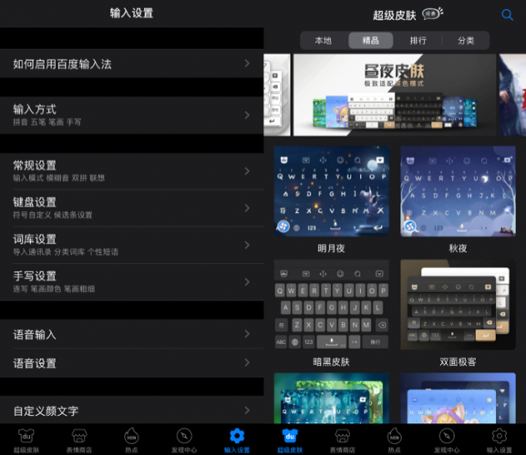 除了推出适配iOS 13的昼夜深浅皮肤套装外,百度输入法最新版还跟随iOS 13系统全面布局,整体风格让用户更具沉浸感,在输入法app的内部设置项以及皮肤浏览页面,也都跟随系统的深色模式而智能切换匹配。