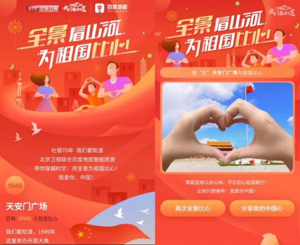 除此之外,作为业内唯一拥有全景数据的地图产品,百度地图与北京卫视联合推出了“我为祖国比个心”活动,上线了“全景看山河,为祖国比心”专题H5活动页,旨在用时间轴为线来展示新中国成立70年来的壮丽发展,同时在H5活动页上展示相关地标的全景图。用户可以“穿越”进入全景图中,点击左上角“比心图标”按钮,可生成“我为祖国比个心”的比心海报,分享至朋友圈。“我为祖国比个心”H5活动通过“穿越时空”的体验,让用户感受祖国70年来的发展与变化,携手尽揽祖国壮丽山河。