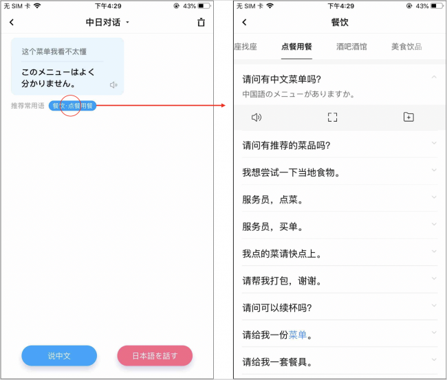 另一方面,对于退税、看不懂菜单等无法用图片表达清楚的语句,百度翻译APP可提供更为直接的“常用语推荐”。首先百度翻译APP会智能分析用户的口语化表达,理解其真正意思,然后提供对应的常用语。例如当我们在国外餐厅点菜时,通常会直接说:“麻烦推荐几道菜,我们不会点你们当地好吃的。”如果按照中文语序直译将非常难懂。而百度翻译APP可提供点餐用餐的常用语,将用户的话转化为“请问有中文菜单吗?”、“请问有推荐的菜品吗?”和“我想尝试一下当地食物。”等等,更易于理解。