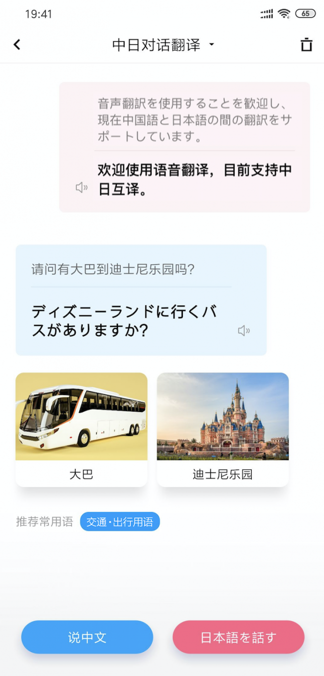 “智能翻译辅助”则可通过图片、常用语帮助用户对外沟通。一方面,相信许多人出国游玩时都有过这样的体会,在与外国朋友的简单交流中,图片往往比磕磕绊绊的口语表达更清晰。“图文联想辅助”功能就是捕捉用户中文里的关键词,提供对应的图片,方便直接展示给外国朋友来沟通。举例来说,如果用户想去东京的迪士尼乐园玩,当他打开百度翻译APP说“请问有大巴到迪士尼乐园吗?”百度翻译APP不仅能翻译为对应日文,还将显示大巴和迪士尼乐园的图片,对方即使没听清对话翻译的内容,看到这两张图片也能明白我们的意图。