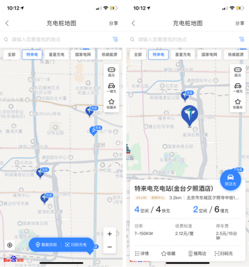 接下来再选择一个离你最近的,点击后能够看到这个充电站有多少个位置、是快充还是慢充、目前还有几个空余、收费标准如何。如果刚好能够满足需要,直接点“到这去”,就能导航前往,可以说是“一气呵成”。