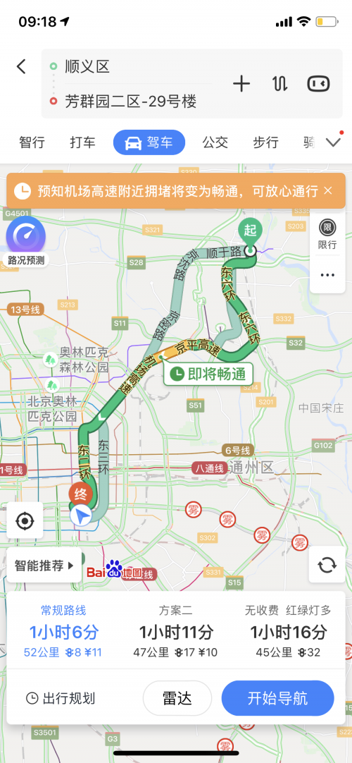 在百度地图里输入起点和目的地后,它能预测出路况变化。我们可以参考屏幕中的“黄条提示”,发现机场高速附近虽然现在堵着,但是一会将变为畅通。同时因为之前我很少选择走红绿灯多的路线,所以系统会把京密路排在后面,首先推荐我走机场高速。通过屏幕上的信息显示,走机场高速虽然有52公里,但是用时却最短,我能够最快到家。