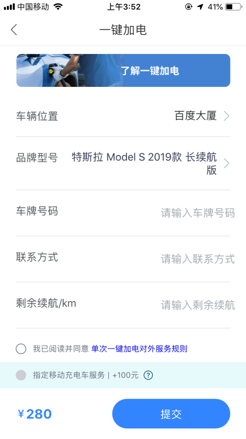 前不久,百度地图还引入了蔚来的“一键加电”服务,通过充电桩地图页面右侧的“一键充”可以进入。进入后依次输入车辆位置、品牌型号、车牌号码、联系方式和剩余续航等信息并提交订单,将有专业的加电专员上门取送车辆并代客加电,同时也能选择充电车到达现场充电。
