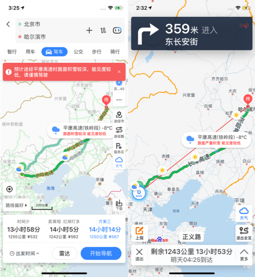 操作依旧很简单,输入起点和目的地后,就能看到屏幕中用红色长条突出提示途径道路的路面气象情况,可以参考这一提示选择路线。在导航过程中,如果前方路线有气象变化,百度地图也会提前10公里对极端气象进行预警提示。我们可以根据提示降低速度,或者更换路线。