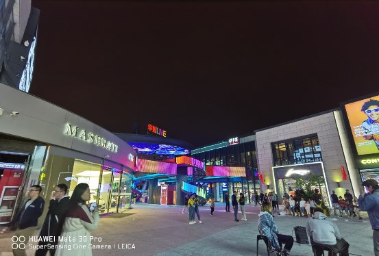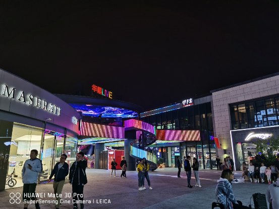 超广角夜景方面,华为Mate30 Pro超广角镜头采用1/1.54英寸超大感光面积,而iPhone11 Pro Max的传感器面积和它的主摄相同。在样张对比中可以看到,华为Mate30 Pro的画面更加纯净,而且在橱窗的高光控制方面同样做的十分出色,左侧店铺的内部细节都能清晰的展现出来。而iPhone11 Pro Max的超广角夜景虽然亮度和华为Mate30 Pro近似,但是超广角镜头依旧白平衡偏黄,画面中的高光控制也不够出色,画面的质感要差华为Mate30 Pro不少。