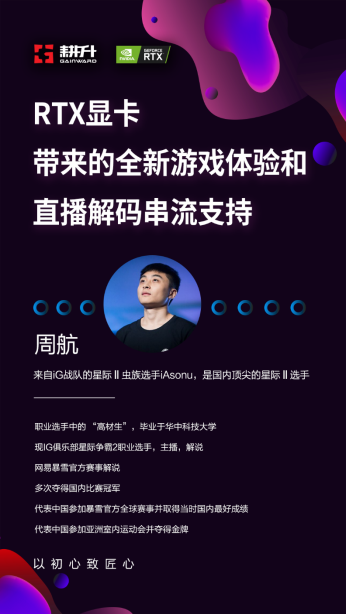 来自iG战队的星际II虫族选手周航(iAsonu),是我们这次讨论会的嘉宾之一,被誉为职业选手中的“高材生”的他,毕业于华中科技大学,多次夺得国内比赛冠军,为中国电竞作出重要贡献,曾经代表中国参加第五届亚洲室内与武道运动会电竞项目的比赛,并在决赛中击败同为来自中国的选手王磊(XiGua)。国手周航如今除了拥有星际II职业选手这个身份外,在闲暇之余还作为主播和解说为星际II竭尽所能。这次讨论会,他将为我们讲解GeForce® RTX SUPER™系列显卡带来的全新游戏体验以及在直播使用NVENC解码器所带来的体验心得。