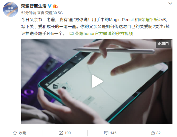 6月21日,荣耀官微发布父亲节感恩视频引发了广泛共鸣,网友纷纷转发并留言表示“瞬间泪目”。不久前,荣耀平板V6刚在荣耀L ife沈阳店开业现场公布了售价,6月18日一开售便赢得了京东平台安卓平板品类单品销量冠军以及天猫2000-3000价位段安卓平板品类销量、销售额双冠军。如今这款热门平板又在父亲节之际打造了这支爆款走心的视频,着实赢得了不少好感和关注。