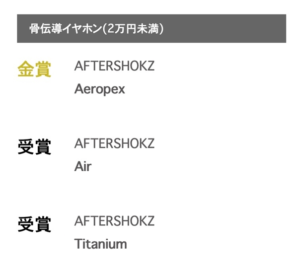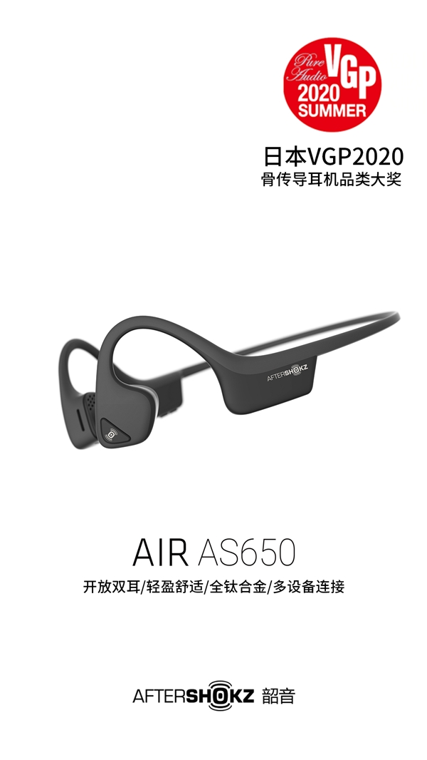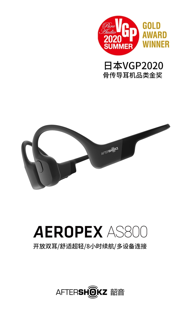 近日,被誉为视听影音器材类的“奥斯卡”——日本VGP2020 Summer 大赏出炉,AfterShokz韶音三款产品Aeropex、Air、Titanium在2万日元以下骨传导耳机中实现霸榜。其中,旗舰骨传导耳机Aeropex更拿下了这个品类的金奖。