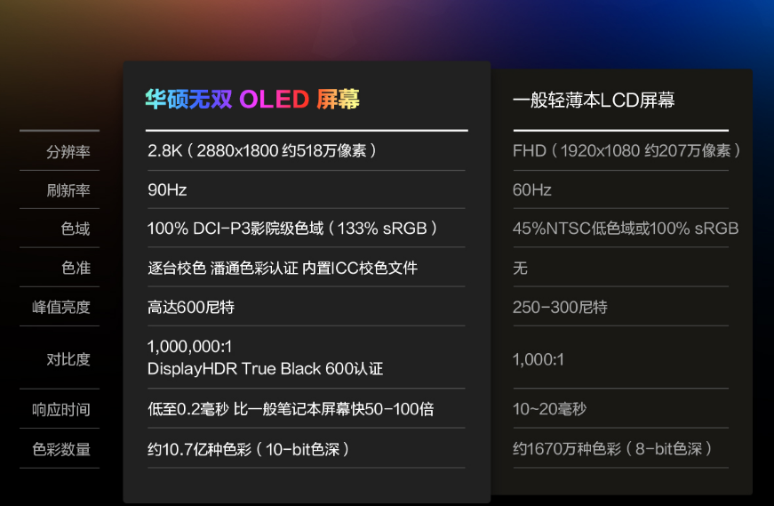 一直以来,OLED屏幕凭借着高饱和度色彩显示、高亮度以及高对比度等优势在笔电市场备受关注。 “华硕好屏”作为华硕轻薄笔记本OLED屏幕独有标准,在原有OLED屏基础上大幅度升级,目前更是成为OLED屏笔记本的规格标杆。