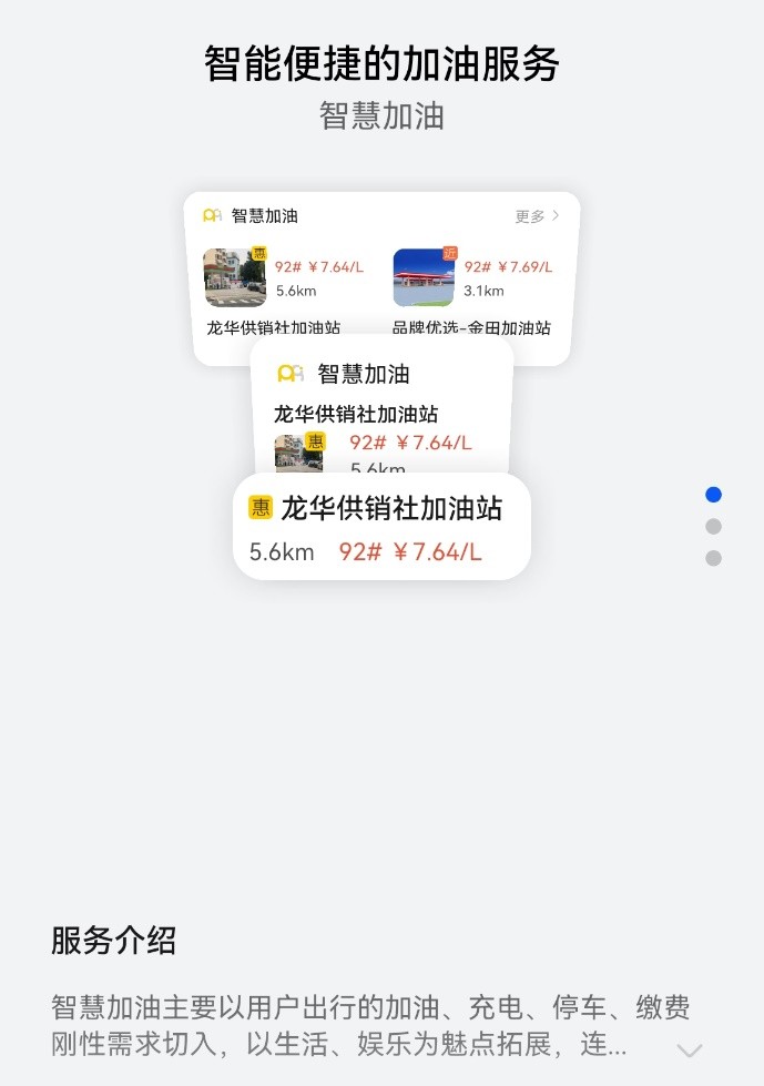 以加油举例,以前看到油量所剩无几时手忙脚乱查询加油站,哪个加油站有优惠信息也不知道,加油完成后还需要下车排队等候缴费、开发票.....现在直接在华为手机右滑至负一屏搜索“智慧加油”元服务,找到附件有优惠的加油站,导航过去加油、缴费、开发票等操作无需下车即可一气呵成。接入元服务后,“智慧加油”用户量相比传统App提升达190%多,车机端用户量提升更达255%之多。