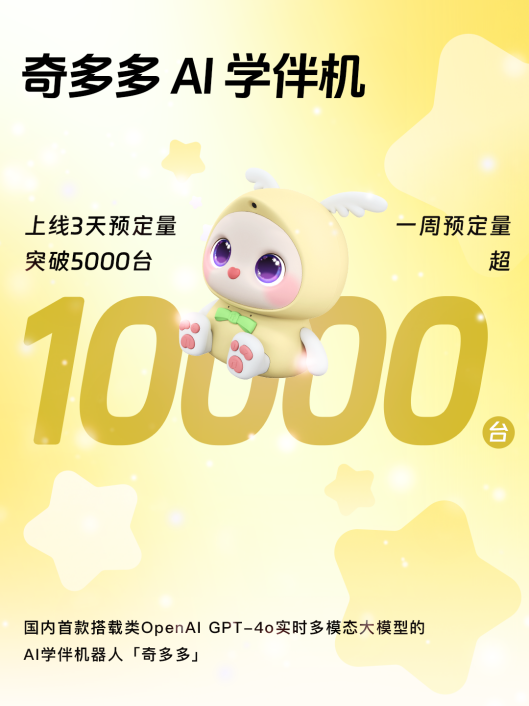 预售破万,奇多多究竟做对了什么? 小乔表示:“首先非常感谢广大用户对奇多多的喜爱和认可。奇多多的突破主要在于两方面:一方面是回归第一性原理,对早教产品功能做深度挖掘;另一方面是我们自研的EVA实时多模态互动模型,能真正满足产品需求。”