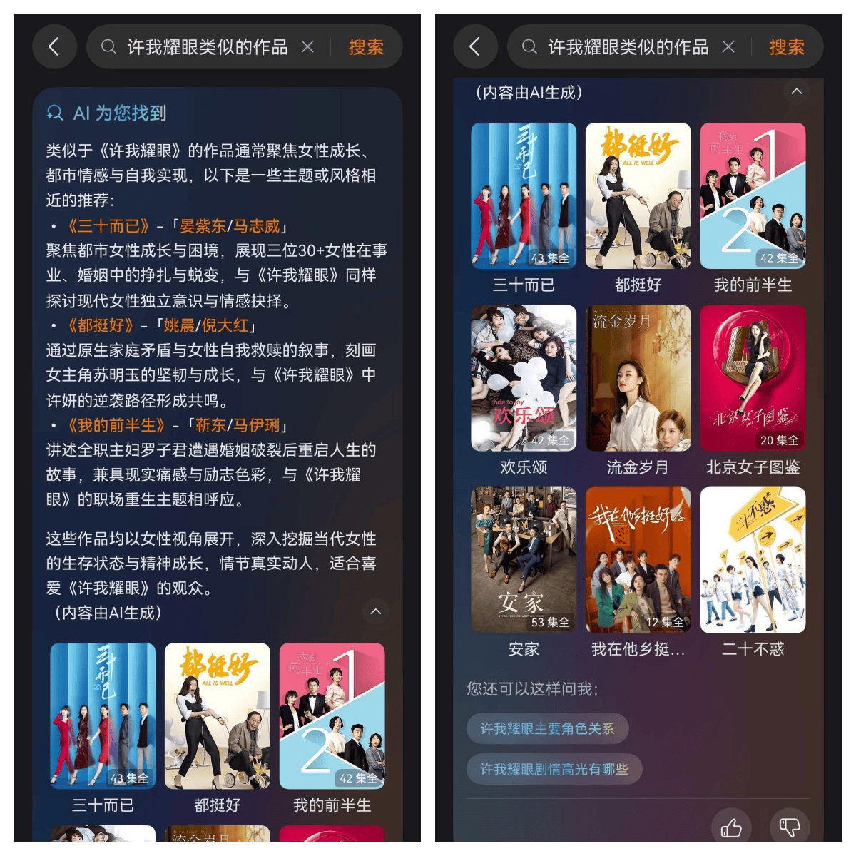 我觉得真正很厉害的,是它的AI搜功能。话说那天追完剧,脑子里突然闪过一个念头:还想看一部类似《许我耀眼》的影视作品,我抱着试一试的心态,直接在搜索框说出了我的想法,没想到华为视频就真的给我推荐了《三十而已》和《我的前半生》等作品。