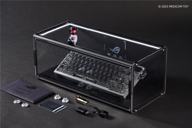限定版包含了ROG夜魔EX SE机械键盘、ROG收藏展示盒和ROG×BE@RBRICK 100% size手办。其中,ROG夜魔EX SE机械键盘作为该套装的灵魂单品,凭借高颜值和出色性能成为玩家首选。