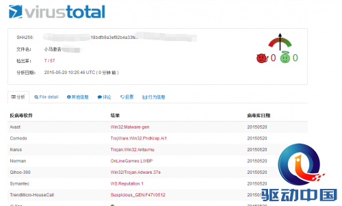 木马查杀 木马在与杀毒软件的对抗中,变得越来越隐蔽,“人生在世”木马就是一个典型。从功能角度来说,“人生在世”大量使用云控结合shellcode的形式,成为真正的“云”木马,木马落到本地的仅仅是一个loader(引导器)模块,只负责在受害者电脑中活下来,并等待云控shellcode下发,功能代码均由云端直接发布,具有无需升级、实时更新的能力。 目前国内仅360杀毒和安全卫士能够全面查杀“人生在世”木马及其变种,国内其它杀毒产品对这一家族木马尚无法识别和防御。 根据VirusTotal扫描结果显示,捆绑木马包目前只有7款杀毒引擎能够识别,国内只有360入围: