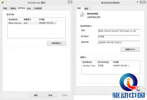 被释放文件MD5分别为: ADSafe.exe : cb4eabb88e154e6e13b73ef7f6d4f6de beikecmm.dll : c05ea3bcd40acc001370c1ad02c01985 其中ADSafe.exe带有有效的数字签名:Beike Internet Security Technology Co.,Ltd