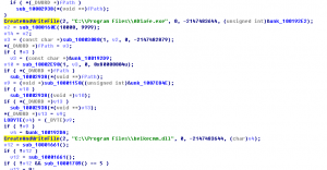 虽然是个dll文件,但实际上木马主体并没有把dll落成磁盘文件,而是直接在内存中加载函数并执行。 该函数会向%ProgramFiles%路径下释放ADSafe.exe和beikecmm.dll,并启动ADSafe.exe
