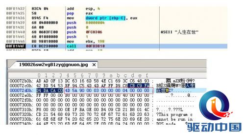 完成后,木马主程序会从伪造的图片文件中,搜索“人生在世”的字符串。“人生在世”字符串之后的数据,即是一个完整的PE文件。