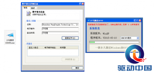 虽然小马激活工具已经发了公告和声明,但怎奈网上浩如烟海的搜索结果真假难辨。这也就给了居心不良者以可乘之机。 伪造的小马激活MD5为:b85507eaf961dae7216b32a99d5ea9dd 所谓的“小马激活OEM9”模仿得很真实,不仅图标和真的一样,界面也非常具有迷惑性。并带有Shenzhen WangTengda Technology Co., Ltd.签发的数字签名,用以躲避部分安全软件的查杀。