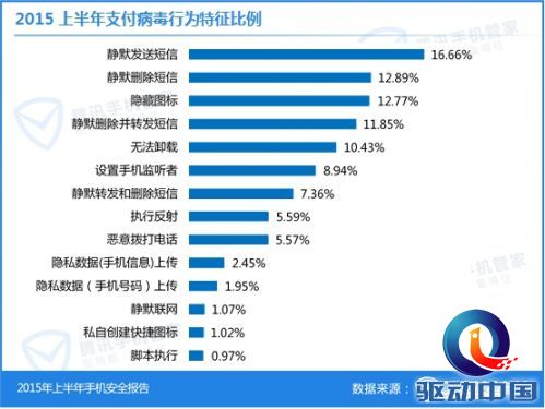 目前移动电子商务进一步繁荣、移动应用数量急剧增长,O2O、移动支付场景应用日渐丰富,使得黑客重点开拓移动支付领域吸金。 腾讯移动安全实验室针对2015年上半年已发现的29762个手机支付类病毒的特征进行归类统计发现,支付类病毒最大特征是表现为静默发送短信,静默删除短信、隐藏图标或静默删除并转发短信。各病毒行为占比分别为16.66%与12.89%、12.77%、11.85%。另外,设置手机监听者、隐私数据(手机信息)上传的病毒行为也分别占据8.94%、2.45%。支付类病毒多半与窃取隐私相关,偷取短信、拦截验证码、上传转发隐私数据等行为是2015年上半年手机支付类病毒的典型特征。
