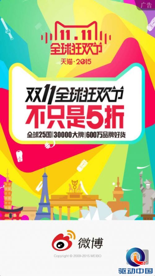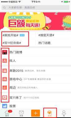 把天猫这次双11主要的三个话题阅读量相加,总和超过30亿,讨论量相加超过5300万,这相当于每个微博活跃用户要看到15次相关的话题,四个微博活跃用户就有一个参与了天猫双11的话题讨论,如此高的数据显示出此次双11狂欢节正形成全民参与之势。 除此之外,为了推广国际业务,天猫还在在双11期间在微博上发起了每天一个超级国家日活动。如在10月22日的“英国主题日”就以#传说中的英国美食#为话题,引发了不少网友关于英国美食的讨论,获得了4467.1万的阅读量和39.9万的讨论量,而@英国驻华使馆的参与为话题添了一把火。“法国主题日”则以#法国红酒当水喝#为话题,引发了不少网友关于法国红酒的热议。 全面包装 营造节日气氛 从连续二十天不同主题的微博客户端开机报头广告,到客户端发现频道的深度定制,再到PC端微博右侧导航栏的天猫双11专区。整个双11期间,无论是PC端还是移动端,只要打开微博就能看到天猫散布在各处的狂欢活动信息。除了热门话题、右侧导航栏、发现页和开机报头等广告以外,甚至底部的发现按钮也被包装成了天猫的logo,这样的包装让微博上的每一个用户都能感受到天猫活动的氛围。