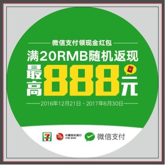微信支付实现台湾吃喝玩乐行全覆盖,无现金也能轻松环岛游 12月21日起,赴台游客在台湾5000家7-ELEVEN便利店任意一家消费时,只需通过打开【微信】—【我】—【钱包】,调出付款二维码或条形码,交由收银员扫码即可完成买单,告别兑换台币和携带现金的烦恼。大大提升顾客买单速度的同时,也还增加了门店的运营效率。 除了快捷的支付体验,7-ELEVEN与微信支付合作还为顾客带来了一波横跨圣诞、元旦两大节日的惊喜优惠活动。2016年12月21日至2017年6月30日期间,顾客在7-ELEVEN使用微信支付消费满20元,即可领取现金红包一个,最高可领888元,优惠名额有限,先到先得。