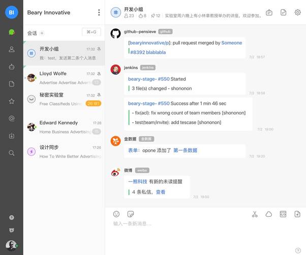 如何降低运营成本,最大程度的节省资源,提升效率,是现代企业面临的重大挑战之一。企业级消息处理平台倍洽(BearyChat)的出现为这个问题提供了一个可行的解决方案,其提倡的 ChatOps 理念不仅可以通过智能聊天机器人帮助企业节省大量的人力成本,更为团队成员提供了一种新的工作沟通方式,在现代工作中,倍洽已成为不可替代的团队效率工具。 倍洽能够将不同场景工作下所需的各种工具、服务整合为统一的工作流,将技术研发、产品设计、市场运营、系统运维、销售客服等角色聚集在一个统一的平台中,再通过对他们日常工作信息的梳理汇总,在信息收集和信息分发上起到关键的串联作用,以此来帮助团队成员了解不同角色成员在进行的工作,减少沟通的繁琐环节,增加团队协作效率。