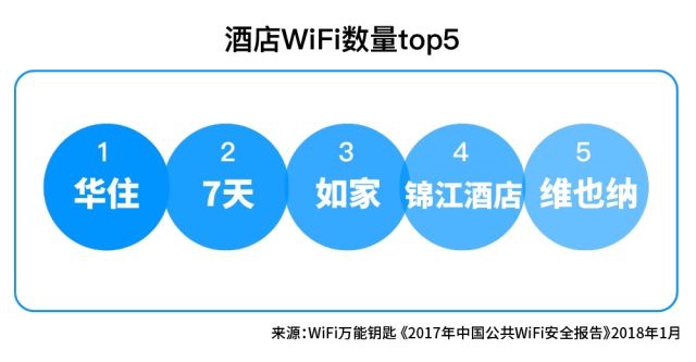 在餐饮美食场景中,快餐行业贡献的WiFi场景占据较大比例。其中,沙县小吃、兰州拉面、黄焖鸡米饭、重庆小面、桂林米粉等本土快餐的WiFi场景数量,比肯德基、星巴克、麦当劳、德克士、必胜客等洋快餐更胜一筹。 4.4酒店集团WiFi数量top 5:华住、7天、如家、锦江酒店、维也纳 各个快捷酒店集团中,华住集团的WiFi场景数量最多,7天、如家紧随其后。